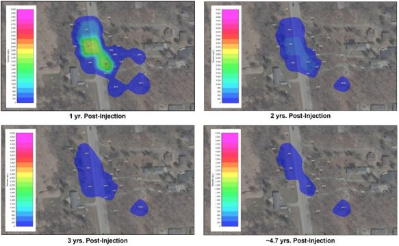 - 2018: In-situ injections BOS 200® where source area treatment and permeable reactive barriers (PRBs) were completed, followed by more than 4 years of performance monitoring
